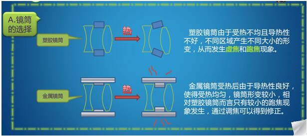 在这里同样涉及到两种镜筒材质的特性,塑胶镜筒由于受热不均且导热性不好,不同区域产生会不同大小的形变,从而发生虚焦和跑焦现象。金属镜筒受热后由于导热性良好,使得受热均匀,镜筒形变较小,相对塑胶镜而言只有较小的跑焦现象发生,通过调焦可以得到修正。