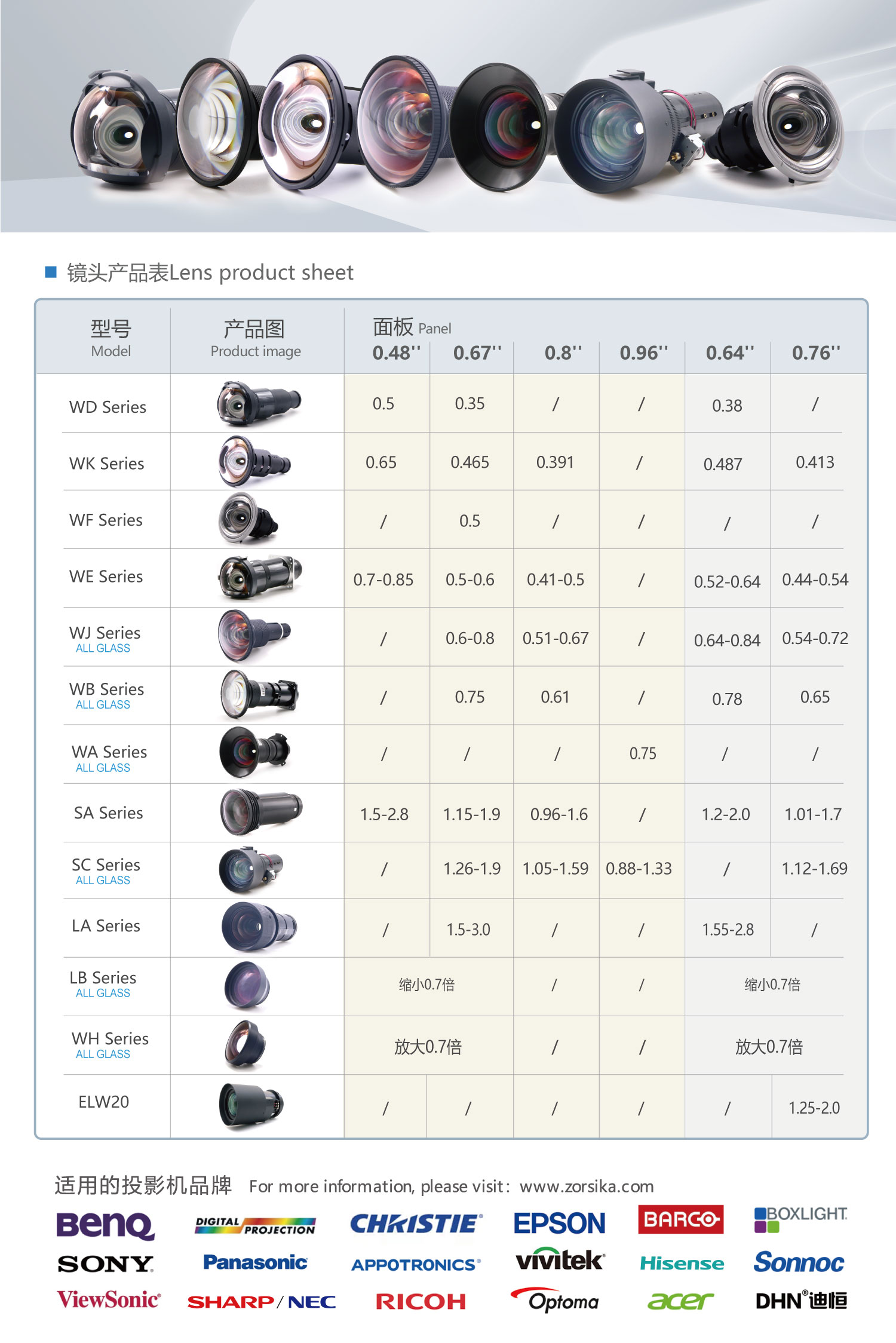 ZORSIKA offers interchangeable wide-angle lenses with throw ratios of 0.35:1, 0.38:1, 0.4-0.5:1, 0.5-0.6:1, 0.52-0.64:1, 0.75:1, 0.78:1, and 0.8-1.33:1. These lenses are compatible with most projector brands and models on the market, effectively meeting the application needs of projectors in various fields.